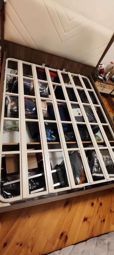 Qaldırılan mexanizmlə sandıqlı yataq dəsti. - Ölçü: 160 x 200 sm - Başlıq: düyməli, yumşaq kapitonajlı mavi parça ilə - Korpus: ağ rəng, geniş daxili sandıq sahəsi - Çarpayı üstü metal karkaslı, qa...
