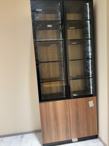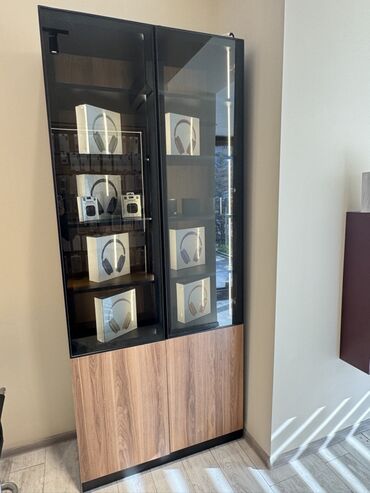 - Şüşə qapılı şkaf-vitrin – içdən LED işıq, bir neçə səviyyəli şüşə rəflər, aşağıda qapalı dolab hissəsi