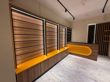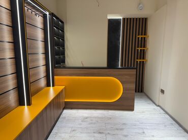 - Kassaya uyğun ön stend və recepsion tipli masa – ön paneldə dekorativ LED işıqlı sarı akril/plexi xətt