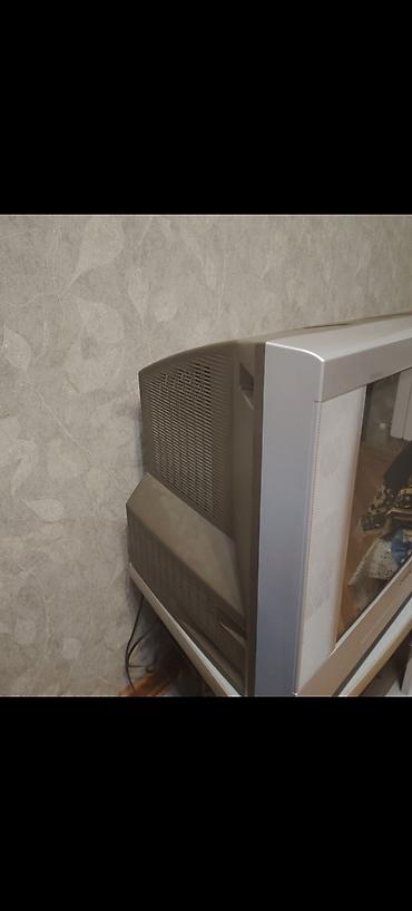 Klassik kineskop TV və alt TV stendi - Ekran tipi: kineskop (CRT), təxminən 29–32 düym diaqonal - Korpus rəngi: gümüşü-boz - Ön paneldə idarəetmə düymələri və IR pult qəbuledicisi - Səs üçün daxil...