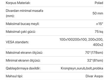 Qiymət əsas profil.şəklinə aid deil hərəkətsiz sadə kronşteyn qiymətidir! Topdan satış mövcuddur Digər bölgələrimizə çatdırılma var Televizorlarin divara vurulmasi. ən sərfəli qiymətlərlə bütü...