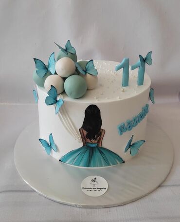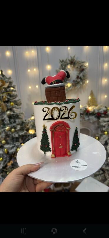 - Şənliklərə uyğun fərdi dizayn: Yeni il mövzusunda “2026” yazılı, bacadan düşən Santa fiquru, qırmızı qapı və yolka bəzəkləri; həmçinin mavi kəpənəklər, dekorativ kürələr və rəqəm şamı ilə bəzədilmiş zərif qız siluetli tort nümunəsi.