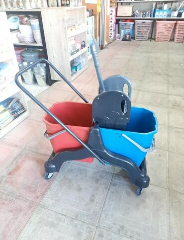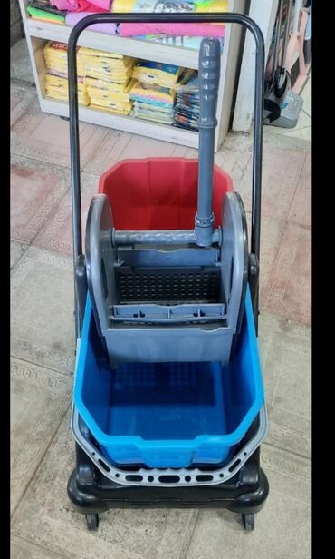 Döner sistemli mop vedrəsi və teleskopik mop dəsti az istifadə olunub tam islekk - İki bölməli vedrə: sağ tərəf su üçün, sol tərəf paslanmayan metal səbətli sıxma bölməsi - Ayaq pedalı olmadan yux...