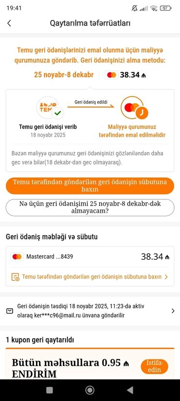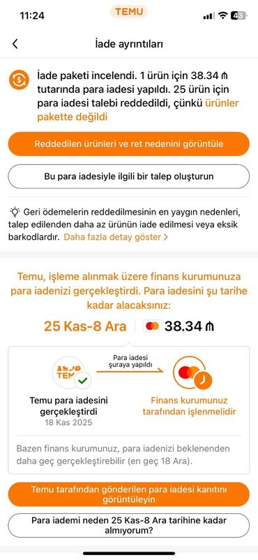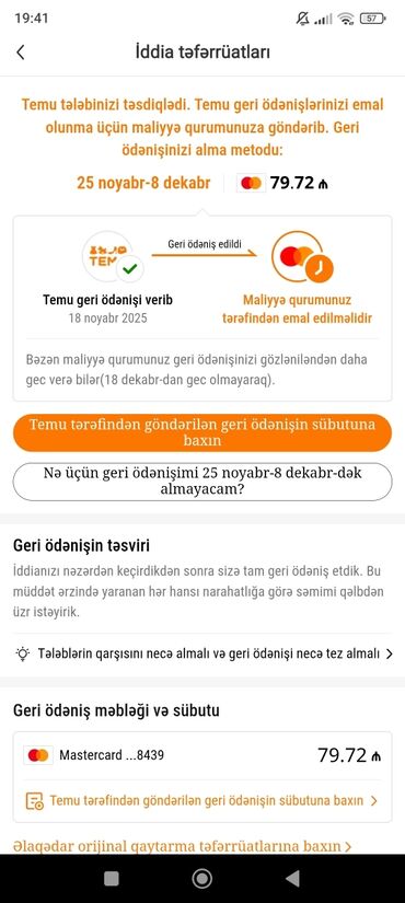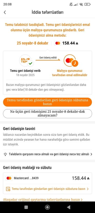 Temu tətbiqində “Geri ödəniş/İddia təfərrüatları” bildirişlərinin ekran görüntüləri paketi