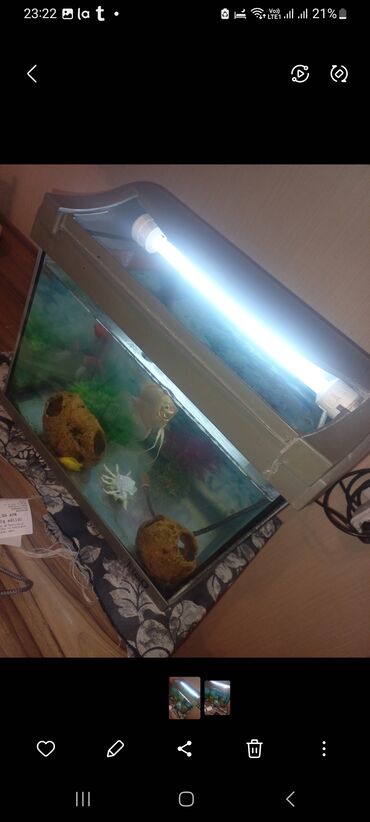Akvaryum ve 4 eded balığ 2 si qızıl balığdır İstifadə üçün qeyd: - Filtr və havalandırmanı qoşaraq suyun təmizliyini təmin etmək - Çınqılın yuyulması və suyun dövri yenilənməsi - Kiçik və orta ölç...