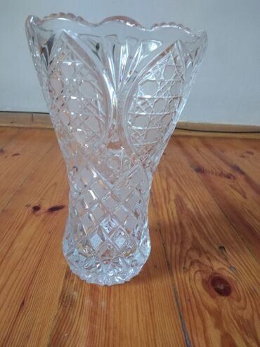 Şüşə/kristal vaza - Material: qalın, şəffaf şüşə (kristal tipli görünüş) - Dizayn: dərin kəsmə naxışlar, romb və oval ornamentlər, parıldayan fasetlər - Forma: yuxarı hissəsi dalğalı kənarlı, orta...