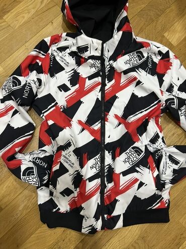 -Bir üzü qara minimalist, sinədə kiçik The North Face loqosu; digər üzü qırmızı-ağ-qara abstrakt printli, çoxsaylı The North Face yazılı.
