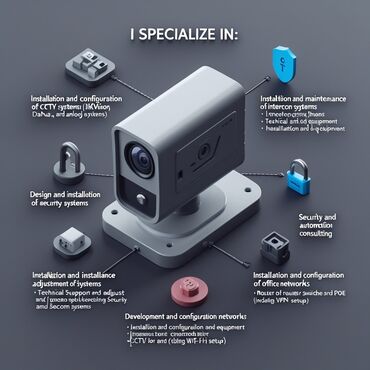 - CCTV müşahidə sistemləri: IP və analoq kameralar, NVR/DVR, Hikvision/Dahua və oxşar markaların quraşdırılması, sazlanması və inteqrasiyası.