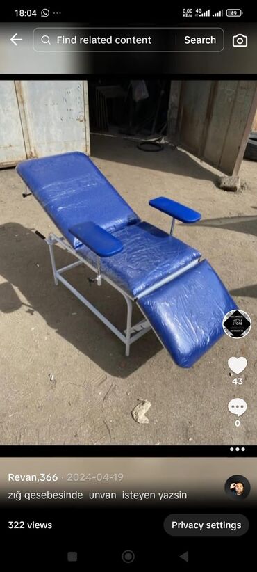 - Prosedur/ donor kreslosu: metal əsaslı, yumşaq döşəmə və baş/ayaq hissəsi tənzimlənə bilən. Mavi rəngli, qol dayaqları var. Qan götürmə, iynə/prosedur, kosmetologiya və müayinə üçün rahat işləmə imkanı yaradır.