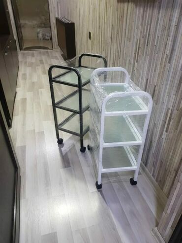 - Servis/alat rəfi: 3 mərtəbəli, təkərli arabacıq. Metal çərçivə, şüşə rəflər. Alət və ləvazimatların səliqəli saxlanması və asan daşınması üçün uyğundur. Ağ və qara variantları mövcuddur.