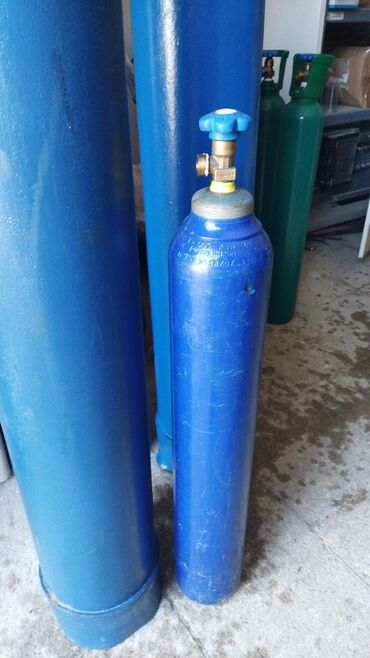 Yaşıl rəngdə olan iki ədəd silindrik qaz balonları. Hər bir balonun üst hissəsində mavi rəngdə tənzimləyici dəstəyi olan pirinç klapanı var. Balonlar müxtəlif qazları saxlamaq və nəql etmək üçün uy...