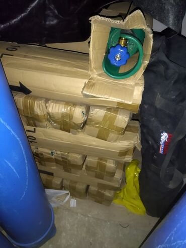 Yaşıl rəngdə olan iki ədəd silindrik qaz balonları. Hər bir balonun üst hissəsində mavi rəngdə tənzimləyici dəstəyi olan pirinç klapanı var. Balonlar müxtəlif qazları saxlamaq və nəql etmək üçün uy...