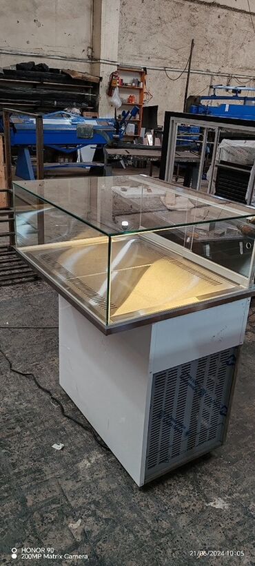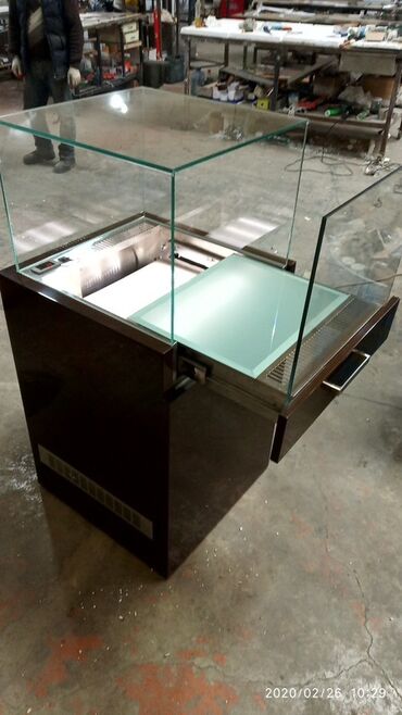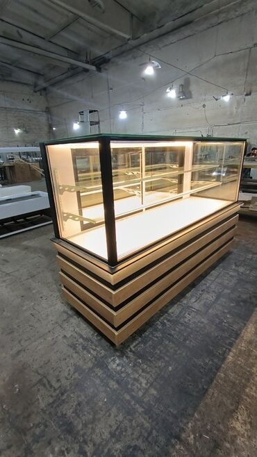 - Şüşə vitrinli tezgah tipli soyuducu: geniş ekspozisiya sahəsi, LED işıqlandırma, taxta dekorlu korpus, üç tərəfdən görünüş, şüşə raflar.