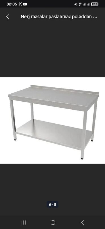 Peşəkar mətbəx üçün paslanmayan poladdan (inox) avadanlıqlar və istehsal xidməti Təsvir: - Restoran, kafe, yeməkxana və istehsal mətbəxləri üçün paslanmayan polad iş stolları, rəflər, dolablar, qa...