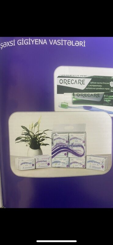 - Şəxsi gigiyena vasitələri: Orecare bitki ekstraktlı diş pastası, gündəlik və gigiyenik yastiqcalar (Anion seriyası).