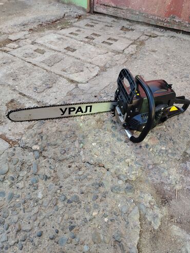 - Benzinli mişar “Урал”: uzun şina və zəncir, yan qoruyucu qövs, üstə baxış pəncərəsi olan yanacaq bakı qapağı.