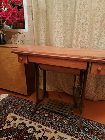 Pedalla işləyən klassik tikiş maşını dəsti. - Dəmir çərçivəli, ayaqla pedalla hərəkətə gətirilən mexanizm - Kəsik təkərli ötürücü və kəmər sistemi - Taxta üst tabla (üzərində qoruyucu örtük), hər ...
