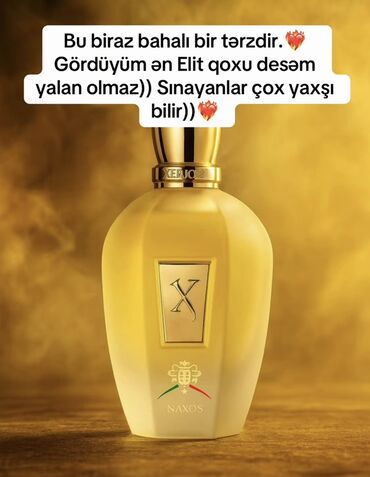 - Xerjoff Naxos: elit tərzli, zəngin tütün-bal kompozisiyası. Bergamot və limon təravəti ilə başlayır, lavanda və darçınla yumşalır, tonka, vanil və tütünlə lüks və isti sona keçir. Qış-payız üçün ideal.