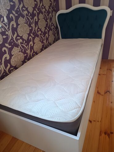 Tək nəfərlik taxta çarpayı + ortopedik döşək dəsti - Ölçü: təxmini 90x200 sm (tək nəfərlik). - Korpus: laminat/MDF əsaslı taxta karkas, düz və möhkəm baza. - Başlıq: yumşaq dəri/parça ilə kapi...