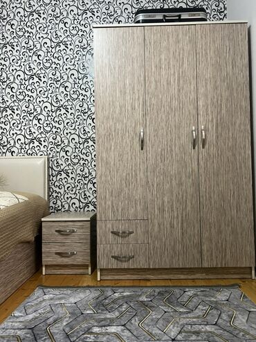 - Komplekt: tək nəfərlik çarpayı (yumşaq başlıqla), 3 qapılı şkaf, 2 çekmecəli tumba