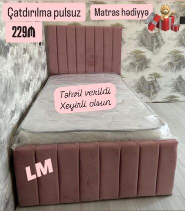 Çarpayı – müasir dizaynlı, yumşaq süngərlə üzlənmiş başlıq və karkas. - Ölçü: 160x200 sm (şəkildə 160x2 qeyd olunub) - Rəng seçimi var - Komplektə hədiyyə matrass daxildir - Çatdırılma və quraşdırı...