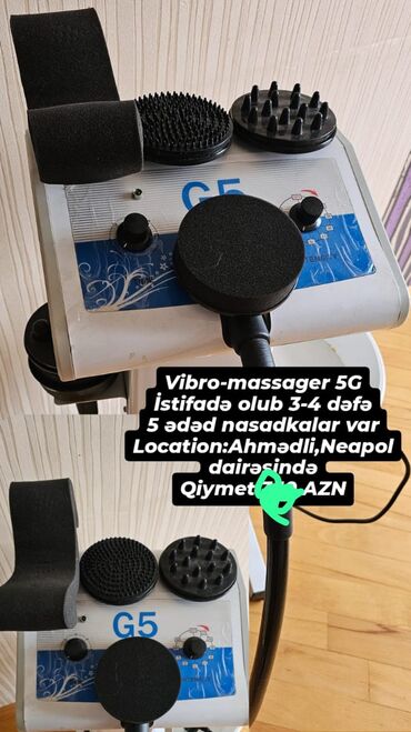 - Vibro-massaj aparat G5: Göstəricidə “G5” modeli. İdarəetmə panelində intensivlik tənzimləyicisi. 5 ədəd nasadka/başlıq: qara köpük başlıq, yumşaq kəmər tipli başlıq, dişcikli iki fərqli sərt başlıq və düz köpük disk. Şəkildə qeyd: “Vibro-massager G5, istifadə olunub 3-4 dəfə, 5 ədəd nasadkalar var. Location: Əhmədli, Neapol dairəsində. Qiymət: … AZN”.