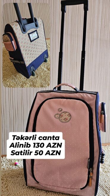 - Təkərli çanta: Çəhrayı və tünd göy rəng kombinasiya, üstündə xırda nöqtəli dizayn. Uzadıla bilən teleskopik tutacaq, iki təkər, üst və yan tutacaqlar. Ön hissədə iri fermuarlı cib, yanlarda əlavə fermuarlı bölmələr. Arxa hissədə şəffaf etiket pəncərəsi. İçlik həcmi səyahət üçün uyğun, fermuarlı əsas bölmə. Şəkildə qeyd: “Təkərli çanta – Alınıb 130 AZN, Satılır … AZN”.