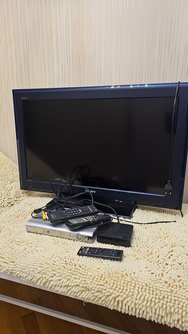 - Televizor və aksesuarlar dəsti: Sony Bravia ekran (yastı panel). Üstündə müxtəlif pultlar və kabellər, metal gövdəli DVD/TV qurğusu və ayrıca “X96 4K” Android TV Box görünür. Kompozisiyada: