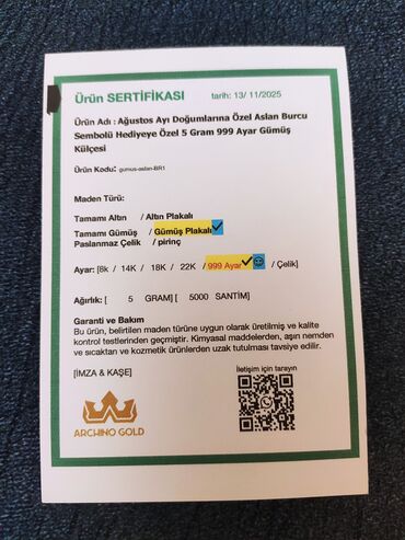 - Sertifikat məlumatı: “999 ayar”, “5 qram” qeydli məhsul sertifikatı əlavə olunur