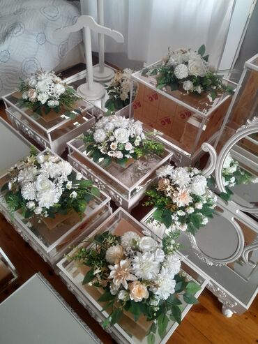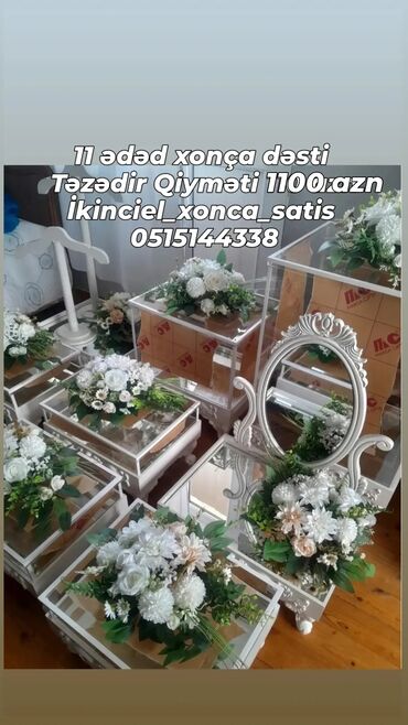 Xonça dəsti – 6 ədəd - Rəng: əsasən pudra/çəhrayı və bənövşəyi tonlar - Tərkib: müxtəlif formalı xonçalar – dairəvi qapaqlı, oval, səbət formalı və beşik formalı dekorativ qablar - Materiallar: mə...