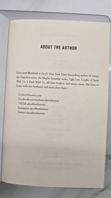 - Daxildə müəllif haqqında səhifə: Colleen Hoover “Verity”, “Hopeless”, “Maybe Someday”, “Ugly Love”, “Confess”, “It Starts With Us”, “It Ends With Us”, “All Your Perfects” və digər bestsellerlərin müəllifidir.