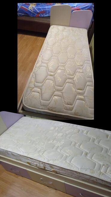 Sadə əməliyyatlar üçün- Tək ölçülü ortopedik döşək: Açıq krem rəngli, altıguşəli (hexa) tikiş naxışlı, kənarları bordürlü. Yan hissəsində daşıma tutacaqları görünür. Uşaq/yeni gənc çarpayısı üçün uyğundur. Standart tək nəfərlik ölçüdədir (təxmini 90×190 sm kateqoriyası). Yuxu səthində bitki motivli naxışlar, hava dövranı üçün yan ventilyasiya dəlikləri var. Çarpayı altı 3 çekmecəli baza ilə uyğun görüntüdədir.