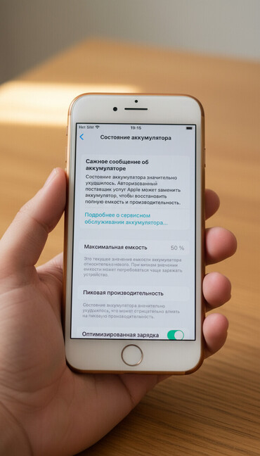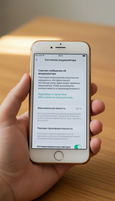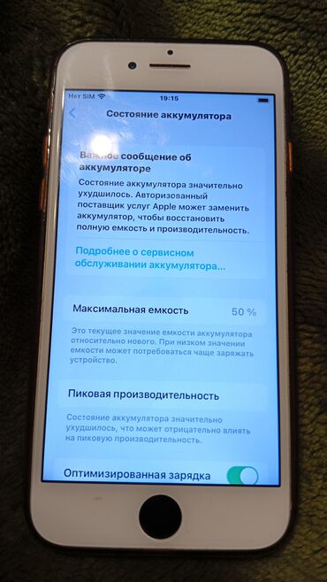 Barmaq iziApple iPhone (Touch ID düyməli model) – ağ ön panel, qızılı/alüminium çərçivə, 4.7 düymlük ekran. Ekranda iOS “Akkumulyator vəziyyəti” bölməsi görünür: maksimum tutum 50% göstərilir, pik məhsuldarlığa təsir barədə bildiriş var, “Optimallaşdırılmış enerji yükləmə” aktivdir. Üst hissədə “SIM yoxdur” statusu görünür. Ön tərəfində dairəvi Home/Touch ID düyməsi, yuxarıda ön kamera və dinamik, sağ tərəfdə enerji düyməsi, solda səs tənzimləyiciləri və səs-küyə qarşı açar. Arxa hissə üçün qoruyucu kılıf taxılıb.