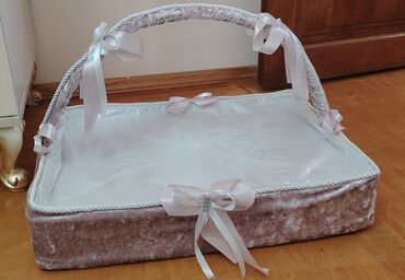 - Pudra-boz məxmər düzbucaqlı səbət: geniş ölçü, qalın və yumşaq bortlar, ipli kənar haşiyə, tül örtük və bir neçə atlas lent bəzəyi ilə. Gəlinlik aksesuarları, hədiyyələr, şirniyyat və suvenir yerləşdirməyə əlverişlidir.