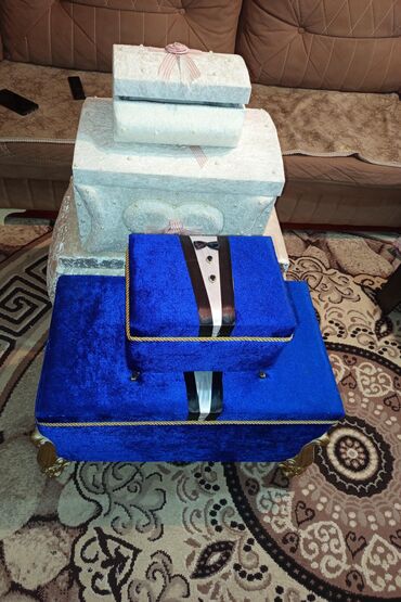 - Mavi dəst: qızılı ayaqlı böyük sandıq + üstündə orta və kiçik qutu; məxmər örtük, kənarları qızılı iplə haşiyələnmiş, ortadan atlas lent və papyon dekoru