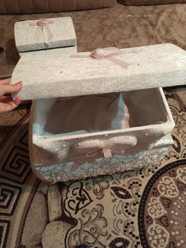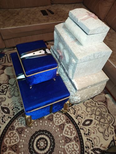 - Materiallar: məxmər tipli parça, dekorativ lent, mirvari, qızılı rəngdə bəzək ayaqları (mavi böyük sandıqda)