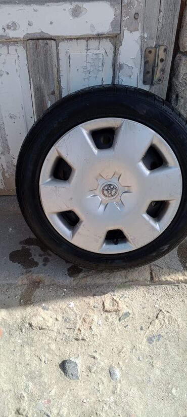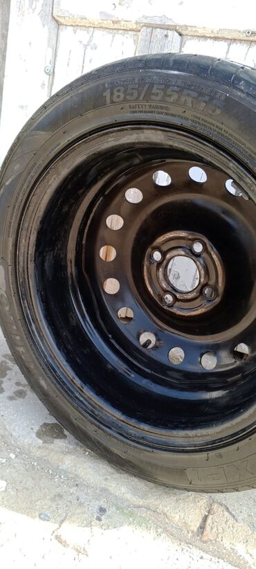 Satılır: təkər + dəmir disk + orijinal boltlu təkər qapağı (Toyota loqolu). - Ölçü: 185/55 R15 (şin üzərində göstərilib). - Disk: 15”, qara rəngli dəmir disk, 4 bolt deşikli naxış. - Təkər: yay/yo...