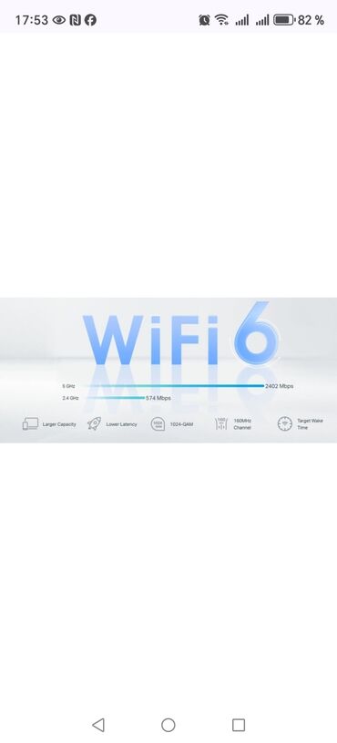 - Wi‑Fi 6 (802.11ax) texnologiyası: 2.4 GHz + 5 GHz ikizolaqlı, ümumi sürət 1.8 Gbps‑ə qədər (1201 Mbps @ 5 GHz, 574 Mbps @ 2.4 GHz).