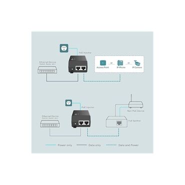 - İstifadə ssenarisi: PoE dəstəyi olmayan switch/routerdan gələn xətti inyektora qoşursunuz, çıxışdan isə tək kabel ilə qurğunuza həm enerji, həm də məlumat verirsiniz