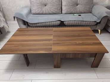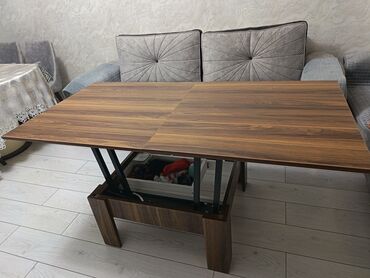 Transformasiya olunan qəhvə masası - Material: ağac teksturalı MDF/LDSP (isti qoz rəngi). - Funksiya: qaldırılıb açılan mexanizm sayəsində qəhvə masasından tam ölçülü yemək masasına çevrilir. - Üs...