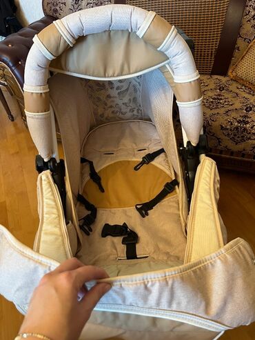 uşaq arabası açıq rəng çanta üzərində həm yatısdırmağ həmdə gəzdirməyə olur az istifadə olunub aşağı yeri var