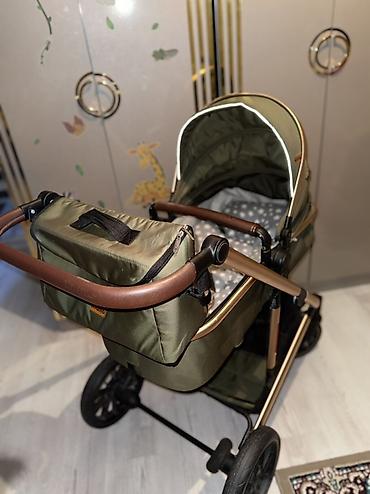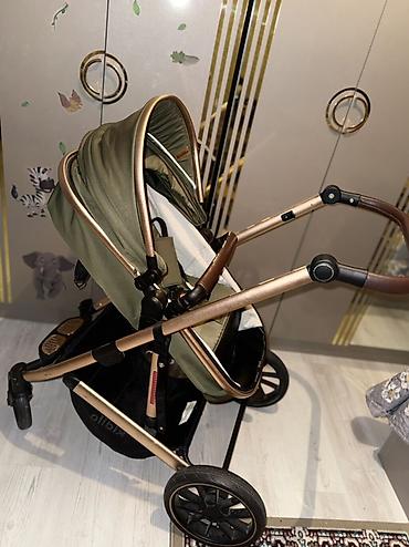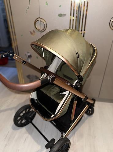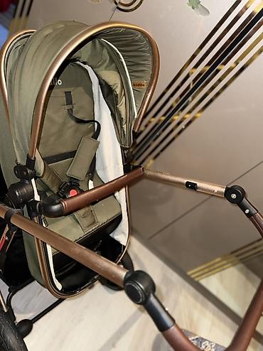 Kidilo uşaq arabası – zeytun-yaşıl kumaş və qızılı/bronza rəngli möhkəm alüminium karkas.