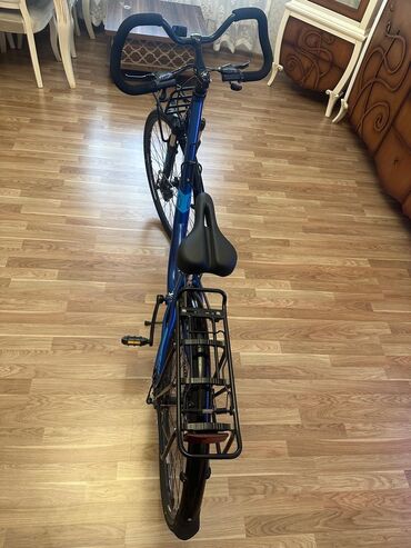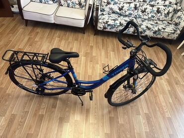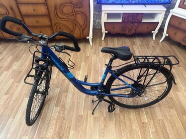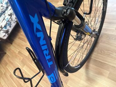 Trinx markalı göy rəngli şəhər velosipedi, gündəlik istifadə və ya işə getmək üçün nəzərdə tutulmuşdur. Velosipeddə ön və arxa yüklüklər var, bu da əşyaları daşımaq üçün əlverişlidir. Disk əyləcləri təhlükəsiz və effektiv əyləcləməni təmin edir. Şəhər yollarında rahat və praktik səyahətlər üçün uyğundur.