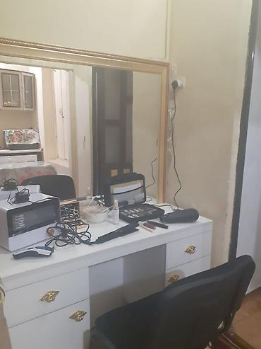- Geniş güzgülü visaj/saç masası və yumşaq oturacaq stulu.