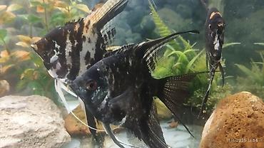 - Skalyar (Pterophyllum) növləri: fotoşəkillərdə 3 ədəd uzunüzgəcli skalyar görünür. Rəng formaları qarışıq mərmər/çəhrayı-qara tonlarda, şəffaf-uzun ventral “bığcıqlar” və hündür kürək-üzgəclərlə. Sakit xasiyyətli, sürülü balıqlarla uyğun yaşayır. Optimal su: 24–28°C, pH 6.5–7.5, orta yumşaqlıq. Həcmi 150 l və yuxarı akvariumlar üçün məsləhət görülür, bitkili və gizlənəcək yerləri olan dekorla yaxşı görünür. Zülallı qranul, lopalar, dondurulmuş yemlərlə qidalanır.