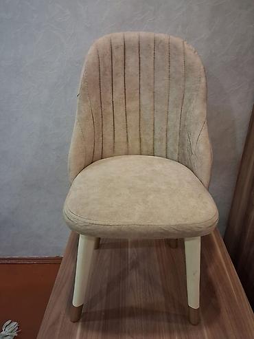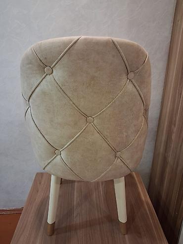- Yumşaq parça ilə üzlənmiş, bej rəngli rahat oturacaq və kürək hissəsi olan yemək/otaq stulu.