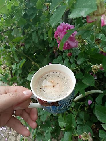 - Bağ-çəmən mühitində isti içki fasiləsi; gül kolları arasında təqdim olunan ətirli qəhvə/isti içki.