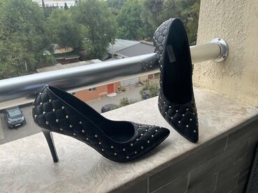 Qadın üçün yüksək daban ayaqqabı - Rəng: qara - Model: iti burun, nazik stilet daban - Üst hissə: hamar dəri toxuması görünüşlü - Dizayn: kənar boyunca piramida formalı qara metal nitlər (studs) -...