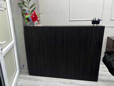 Ölçü təxmini (şəkillərə əsasən): hündürlük resepsiyon tərəfdə təxminən döşəmədən sinə səviyyəsinə qədər, dərinlik standart iş masasından bir qədər çox; eni ön panel boyu genişdir.