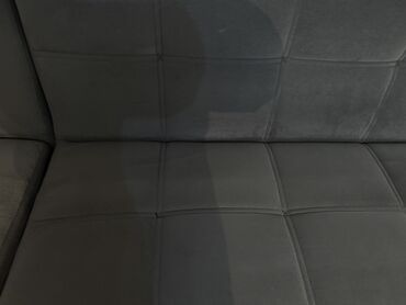 - Rəng/material: Tünd boz, yumşaq toxumalı parça üzlük; qara rəngli, hamar səthli yan dayaq və baza